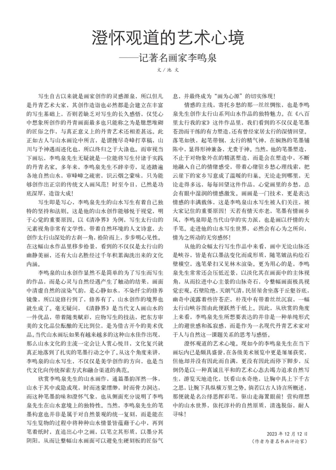 北京工艺美术出版社近日推出了中国高等美术院校名师教学范本《李鸣泉水墨写生作品选》。这部作品集荟萃了李鸣泉老师数年来的水墨写生精华,全面展示了其卓越的艺术造诣和独特的艺术风格。李鸣泉老师是中国当代著名画家,也是全国为数不多集中国美协、中国书协、中国作协为一身的三栖国家级会员。自2019年11月份在国家画院美术馆成功举办了由“雪”为主题贯穿了整个创作脉络的“故乡--李鸣泉国画作品展”以来,他不断努力探索新的绘画语言和表达形式。师法自然,坚持每年多次走入太行山深处,现场展开画卷与天地对话。为道日损,用简单的黑汁和清水在宣纸上描绘心中意向,在水墨写生创作里悟道古法“墨分五色”的绚烂缤纷。这种对艺术的坚守与执着追求,使得他的作品笔墨独具匠心、气韵生动、笔墨淋漓,充满了生命力和感染力。《李鸣泉水墨写生作品选》不仅是对李鸣泉老师多年来太行山水墨写生作品的一次全面梳理,更是对中国传统水墨艺术传承成果的一次深入挖掘。作品集中收录的每一幅作品,都饱含着李鸣泉老师对大自然和生活的感悟,展现出太行山的雄伟壮丽与自然之美的完美结合。无论是山川草木,还是云雾流水,都刻画得生动逼真,充满诗意。这部作品集的出版,无疑是对李鸣泉老师艺术成就的极高赞誉。它不仅将成为高等美术院校师生学习水墨画的珍贵教材,为广大艺术爱好者提供一份欣赏和学习水墨艺术的珍贵资料,同时也将推动中国水墨艺术的发展和繁荣。北京工艺美术出版社表示,他们始终致力于传承和弘扬中华优秀传统文化,推出更多具有时代特色和民族特色的艺术佳作。随着《李鸣泉水墨写生作品选》的出版,他们将继续挖掘和培养更多优秀的艺术家,为推动中国艺术事业的蓬勃发展贡献力量。在当今全球文化交融的背景下,中国传统水墨艺术逐渐走向世界舞台。李鸣泉老师的水墨写生作品作为中国传统水墨艺术的杰出代表,不仅在国内享有盛誉,也在国际艺术界产生了广泛影响。这部作品集的出版,将进一步推动中国传统水墨艺术的国际传播与交流,提升中国艺术的国际影响力。总之,《李鸣泉水墨写生作品选》的出版是一项意义重大的文化盛事。它见证了中国传统水墨艺术的传承与创新,彰显了中国艺术家的卓越才华与精神风貌。我们相信,随着更多优秀作品的涌现,中国艺术事业将迎来更加辉煌的未来。 (东美)