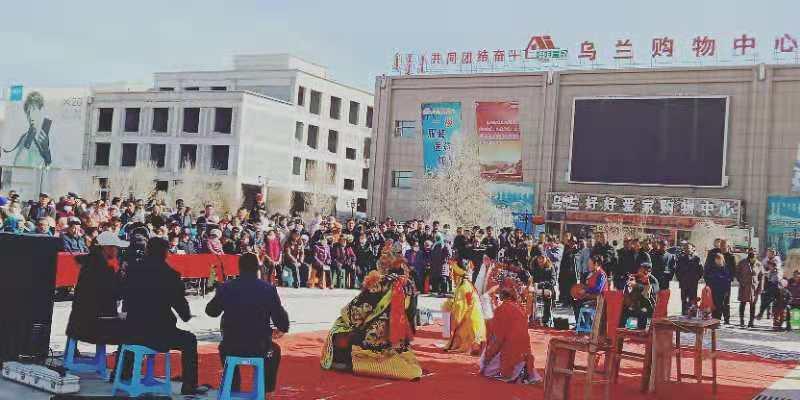 ↑2019年元宵节期间,秦腔业余剧团在乌兰县城购物中心广场上,为百姓演出《二进宫》。(图片由受访者提供)