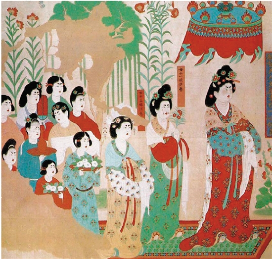 我的壁画工作室于2003年应邀为西安法门寺博物馆绘制陈列画,敦煌唐代壁画是创作的重要参考和依据,举凡衣冠服饰、建筑器物无不以唐画为准。这次创作前后进行了大半年,几乎无日不翻敦煌壁画图书,使我对唐代服饰包括鞋帽披带的样式有了明确的了解。画必有据,并不是我的发明。创作历史题材作品,追求真实再现历史场景,包括衣冠服饰的还原,曾是文艺界的共识,大家都在努力实践,冀有突破。我只是在此氛围下,做了一次饶有兴趣的还算成功的实践。