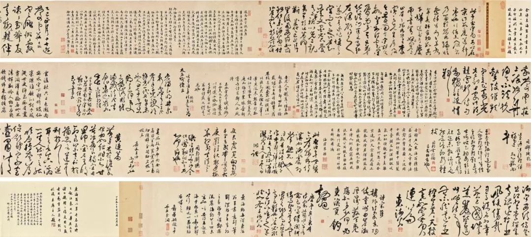 《守南安送行诗卷》原为张东海往南安致仕时,诸贤为其送行而作。后张弼题书于其间,除自作诗数首外,并补述书者及与其交往经过,为研究张弼生平不可多得之重要历史资料。卷内囊括明成化时期主流文人如张弼、李东阳、程敏政、张惟健、乔维翰、李杰、刘玙、王佑、姚绶等人之诗作及书法,钤有卞永誉「式古堂」鉴藏印共十六方,及张珩、韩绳夫题跋。
