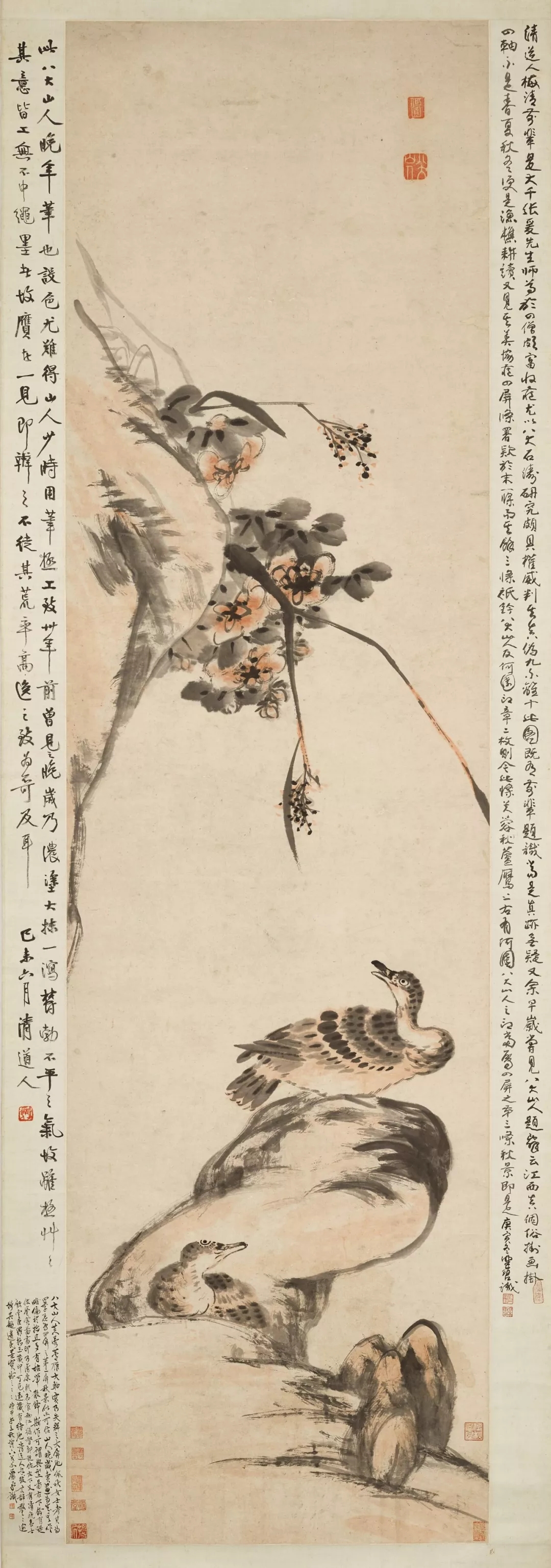 《芙蓉芦雁图》高逾二米,设色鲜明,构图简略而厚实,得天然之趣,为八大山人暮年绘画典型作品。